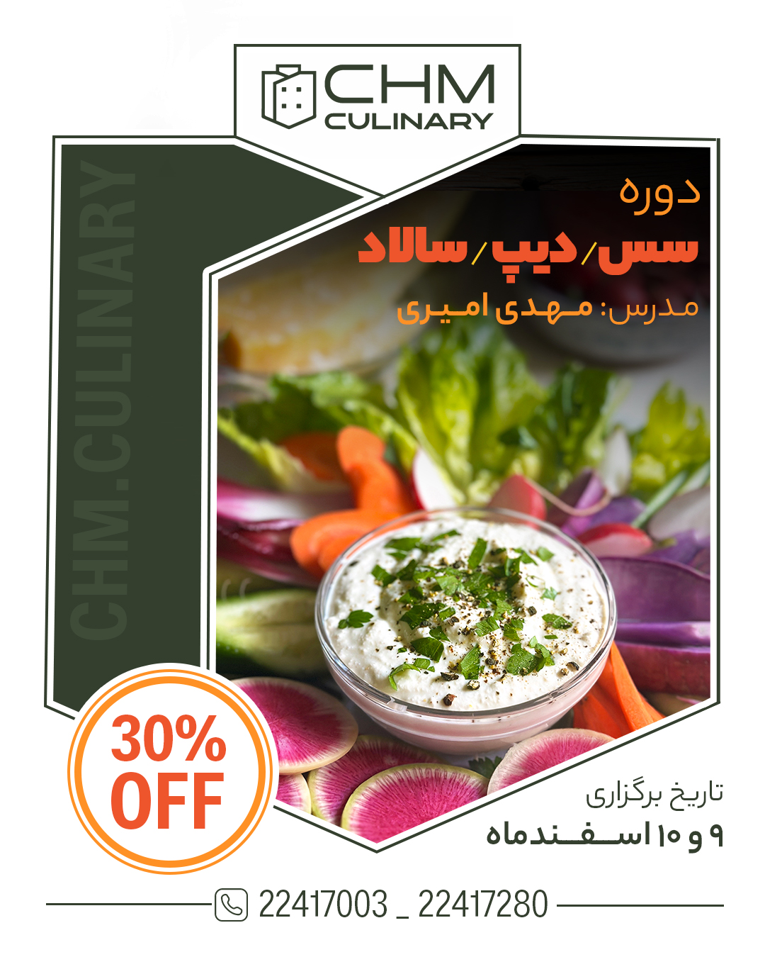 دورهٔ تخصصی سس، دیپ و سالاد یک برنامهٔ آموزشی جامع و کاربردی است که با تمرکز بر تکنیک‌های حرفه‌ای و شناخت طعم‌ها، هنرجویان را برای فعالیت مؤثر در آشپزخانه‌های حرفه‌ای آماده می‌کند. در این دوره، از آشنایی با مواد اولیهٔ پایه، امولسیون‌ها و اصول طعم‌سازی گرفته تا روش‌های استاندارد تهیهٔ انواع سس‌های گرم و سرد، دیپ‌ها و سالادهای کلاسیک و مدرن آموزش داده می‌شود. شرکت‌کنندگان با تعادل طعمی، بافت مناسب، رنگ و نحوهٔ سرو آشنا می‌شوند تا بتوانند ترکیباتی هماهنگ و قابل‌اجرا ارائه دهند.